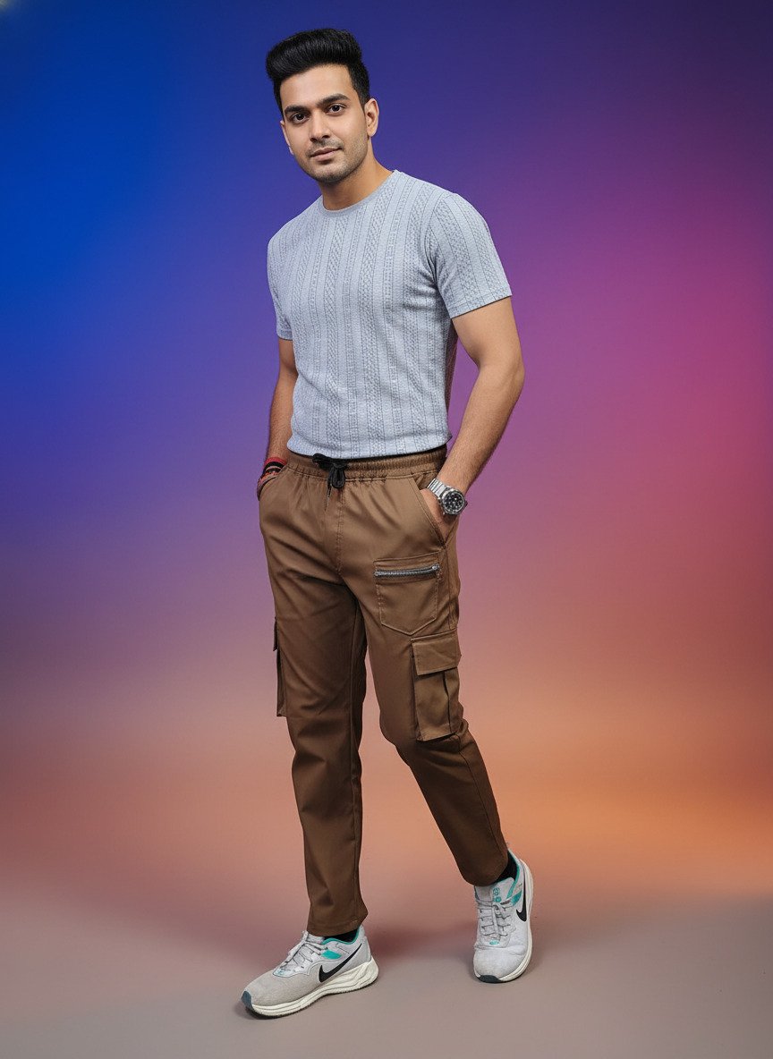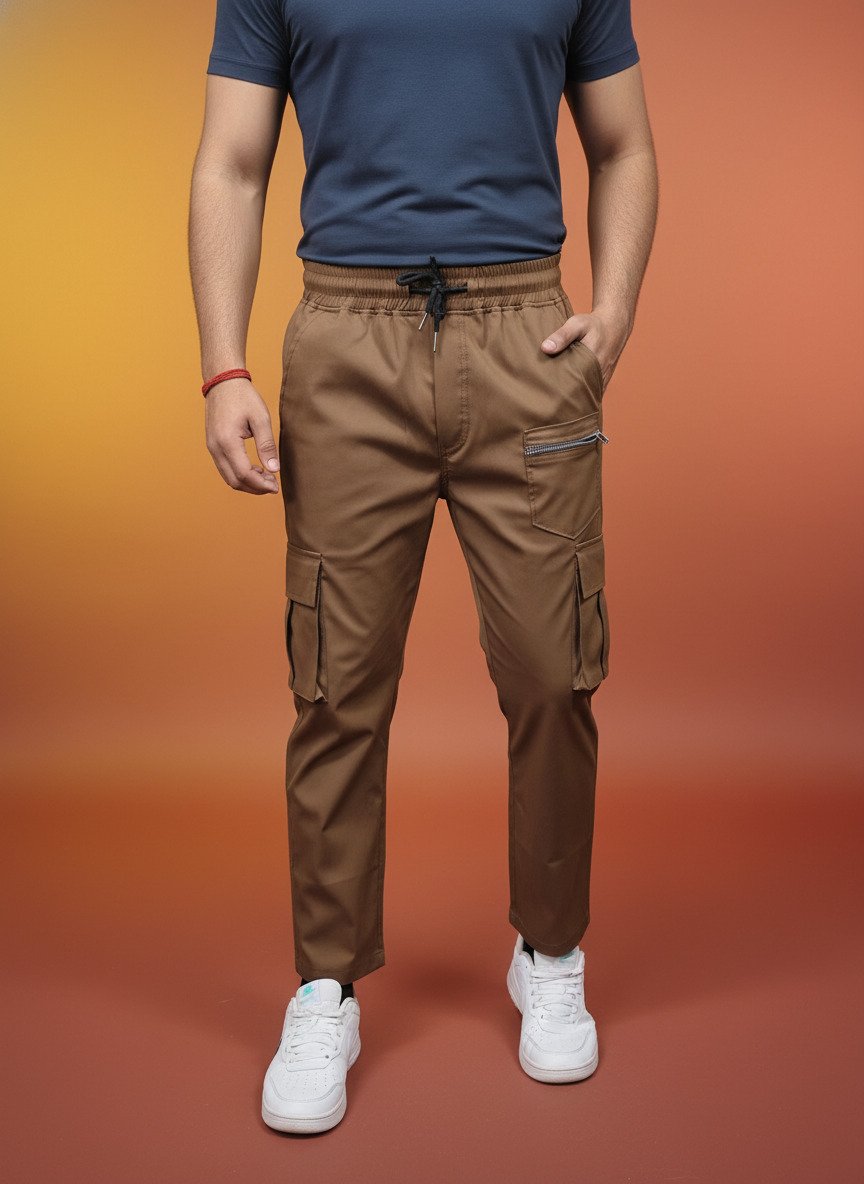 The modern cargo layout includes dual flap pockets, an additional side zip pocket, and deep front pockets—providing practical storage and trendy styling. The elastic waistband with adjustable drawstring ensures a secure, flexible fit suitable for casual wear, gym use, travel, and outdoor lifestyles.